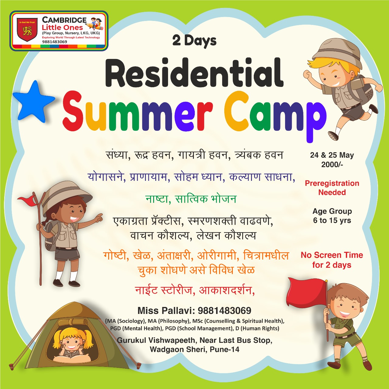 Join us for an exciting 2-day residential summer camp designed to engage kids aged 6 to 15 in a world of fun, adventure, and learning! Our camp offers a perfect blend of outdoor activities, creative workshops, team-building exercises, and relaxation, all in a safe and welcoming environment. From nature trails to arts & crafts, and team games to talent shows, there’s something for everyone! This immersive experience will not only help children build confidence and new skills but also make lasting memories and friendships. Come and discover the joy of outdoor exploration and personal growth this summer!